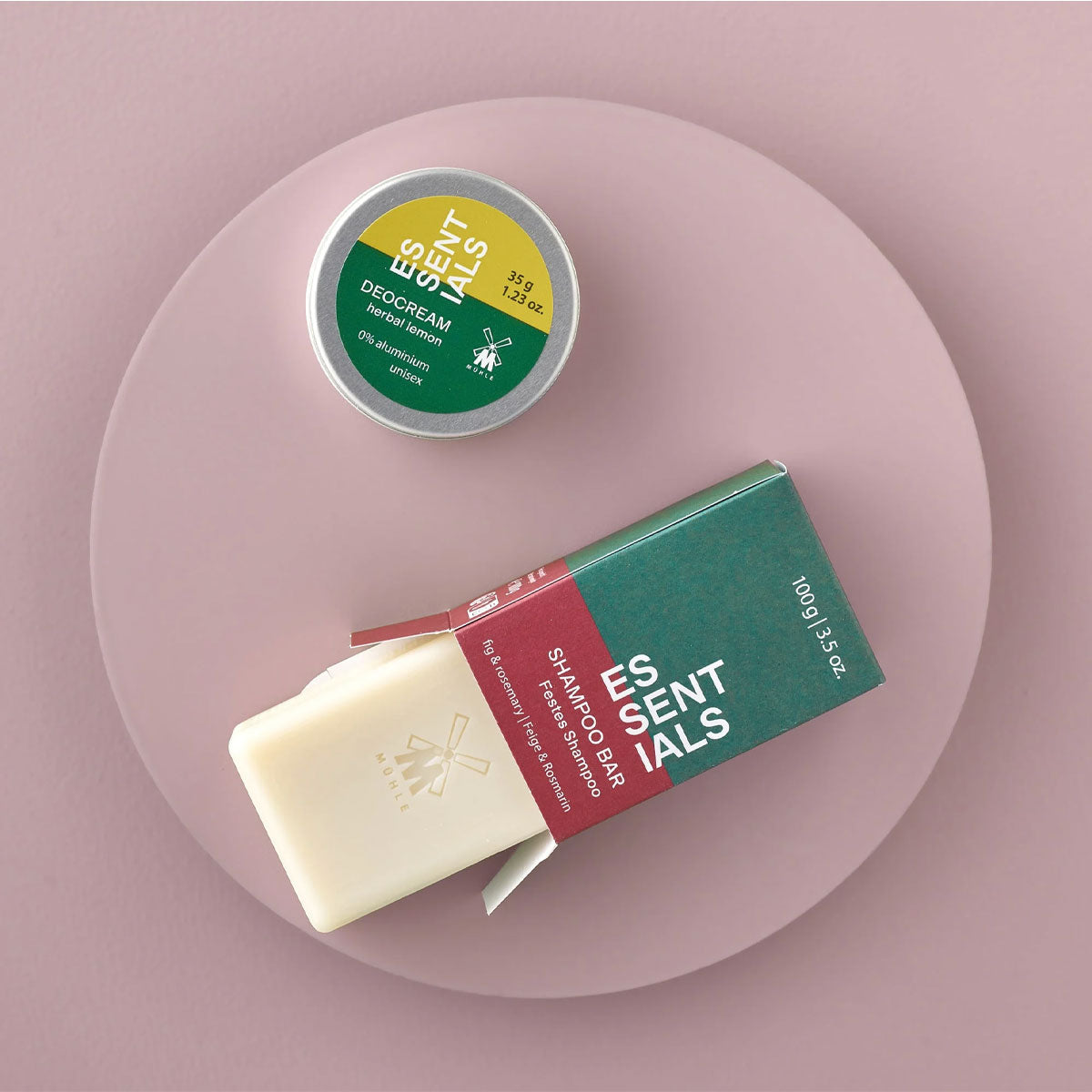 Die MÜHLE Essentials Serie überzeugt mit rein natürlichen Inhaltsstoffen: reduziert auf das Wesentliche. Während das feuchtigkeitsspendende Gesichtsserum bewusst auf Duftstoffe verzichtet, bringen Deocreme, Shampoo und Körperseife jeweils ihre ganz eigenen Duftnoten mit. Ein sanfter Hauch von Rosmarin und Feige hier. Da eine charakterstarke Kombination aus Zitrone, schwarzer Johannisbeere, Vanille, Tonkabohne und Zedernholz. Die kompakte Größe und feste Konsistenz machen Shampoo, Seife und Deocreme zur idealen Reisebegleitung. Gleichzeitig sind sie deutlich ergiebiger als flüssige Varianten und stehen nachhaltig verpackt im Badezimmer: Zero Waste dank Papier, Glas und Aluminium anstelle von Plastikmüll.